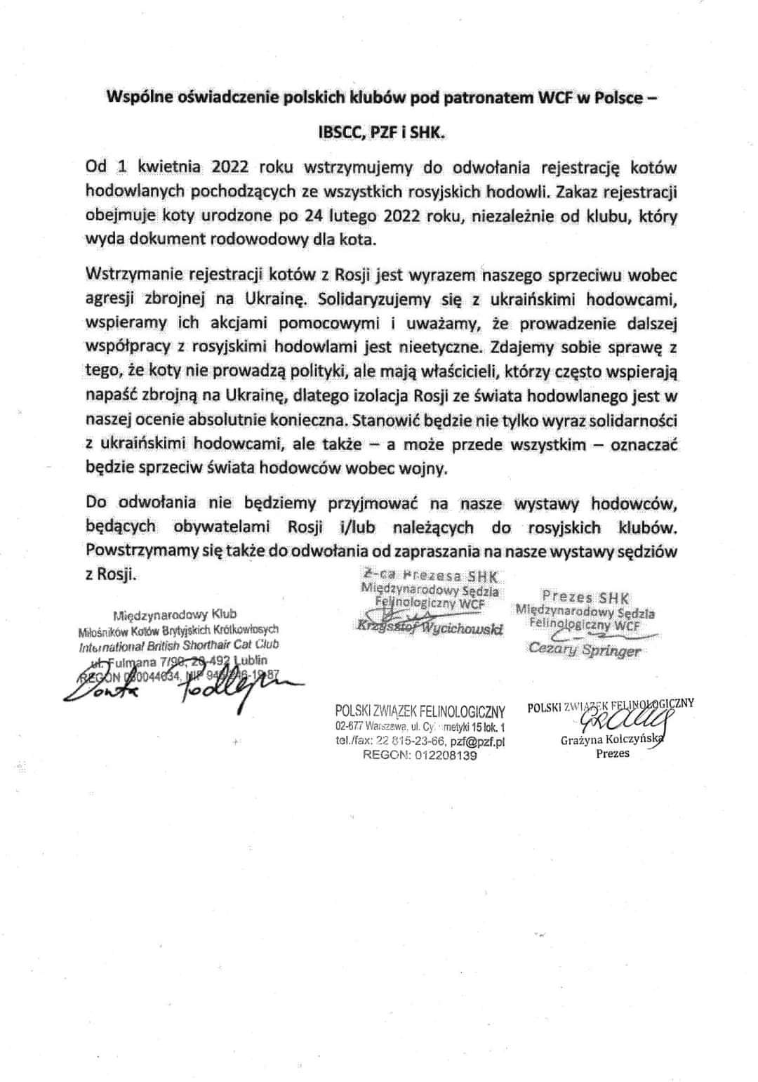 Jednym z wydarzeń była publikacja decyzji 3 klubów zrzeszających hodowców kotów o zaprzestaniu z dniem 1 kwietnia 2022 roku rejestracji kotów urodzonych po dacie 24 lutego 2022 roku pochodzących z rosyjskich hodowli.